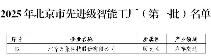 近日,北京市经济和信息化局发布2025年北京市先进级智能工厂(第一批)名单,万集科技“智能网联终端产品智造工厂”成功入选,这是公司在推进智能制造、提升系统集成能力方面取得的重要阶段性成果。